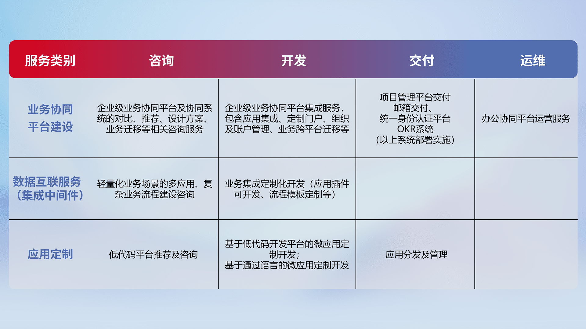 针对钉钉、、、、企微、、、IDaas等平台级产品提供产品的规划、、方案、、交付、、、定制化开发等服务,,,实现如统一协同办公、、、智能客户服务、、、混合会议管理、、、智能数据查询、、、、等业务场景,,,,实现数字化转型。。。